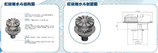由斗體、導(dǎo)流罩、出水短管、連接壓板和整流器等組成。導(dǎo)流罩是用來(lái)攔截樹(shù)葉等固體雜物的雨水斗部件,兼有整流作用;整流器是虹吸雨水斗的重要部件,用來(lái)疏導(dǎo)水流、 消減旋流和減少空氣進(jìn)入 雨水斗出水短管;虹吸雨水斗能夠在較小的斗前水深的情況下,達(dá)到滿(mǎn)流狀態(tài)。我們公司開(kāi)發(fā)的數(shù)十種虹吸式雨水斗專(zhuān)利產(chǎn)品,符合《虹吸雨水斗》CJ/T245-2007 國(guó)家標(biāo)準(zhǔn),排水量從 6L/s~120L/s,適用于各種類(lèi)型的屋面。
